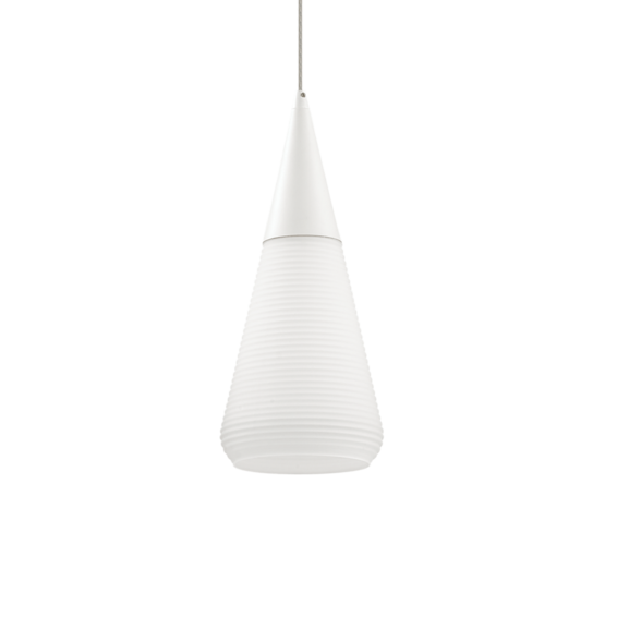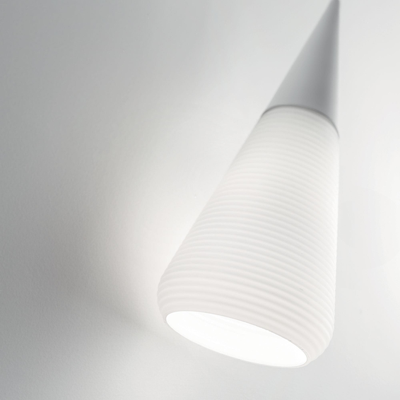 Металлический каркас с матовой отделкой. Тканевые кабели. Рассеиватели из выдувного и травленого стекла в белом корпусе.