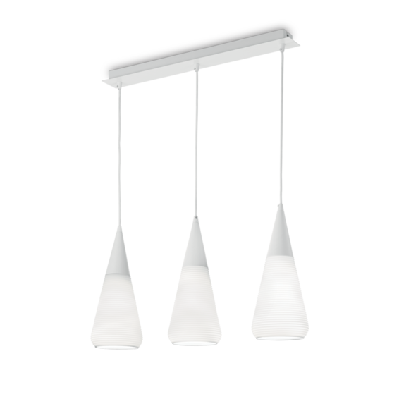 Металлический каркас с матовой отделкой. Тканевые кабели. Рассеиватели из выдувного и травленого стекла в белом корпусе.