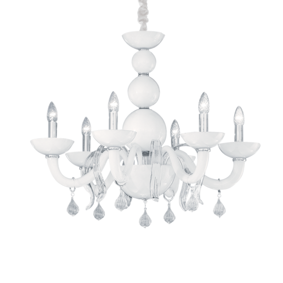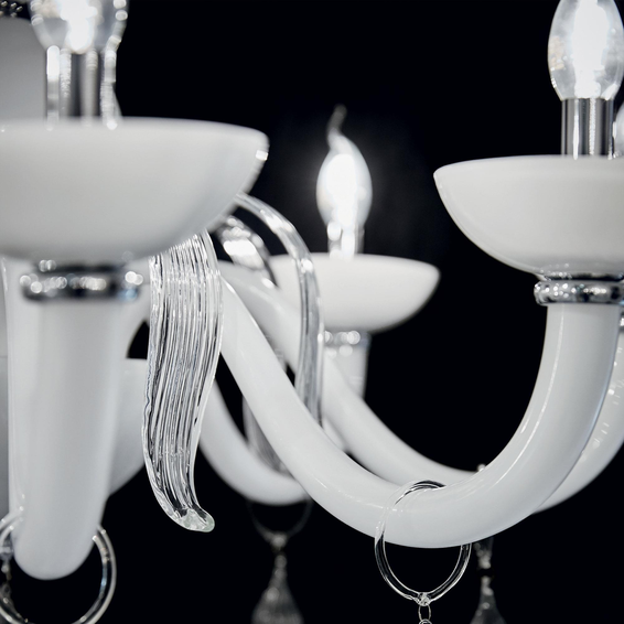Люстра из дутого стекла ручной работы с покрывающими патроны колбами и элементами из хромированного металла.