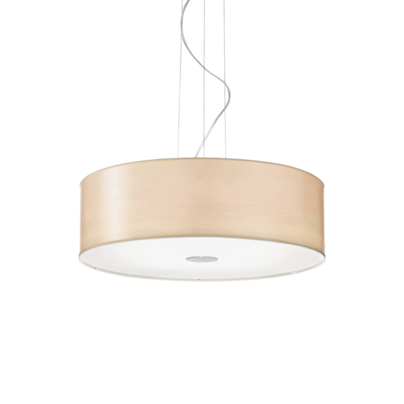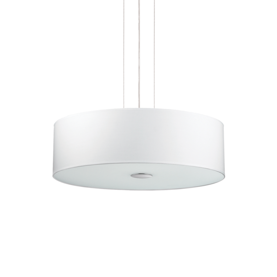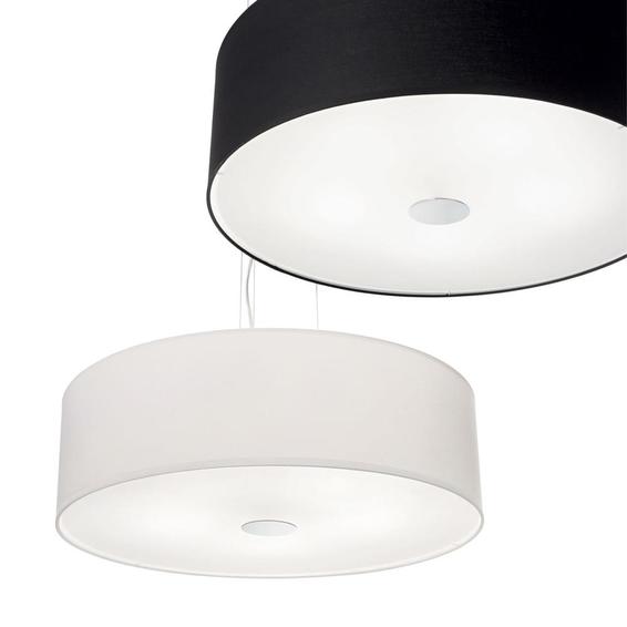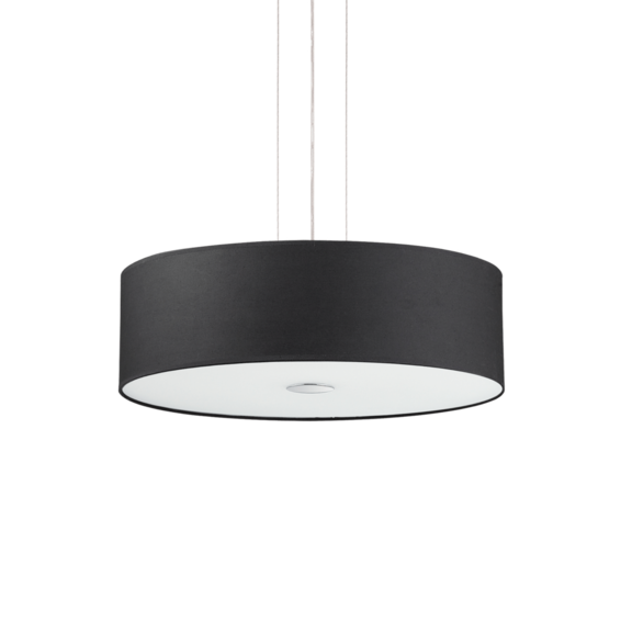 Арматура из хромированного металла. Рассеиватель из ПВХ или ткани, снизу закрыт прозрачным матовым стеклом. Подвесы с тросиками и регулируются по длине.