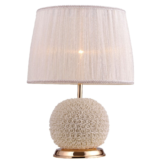 Каркас светильника изготовлен из металла с гальваническим покрытием под золото, декоративные керамические элементы, абажуры из белого текстиля.