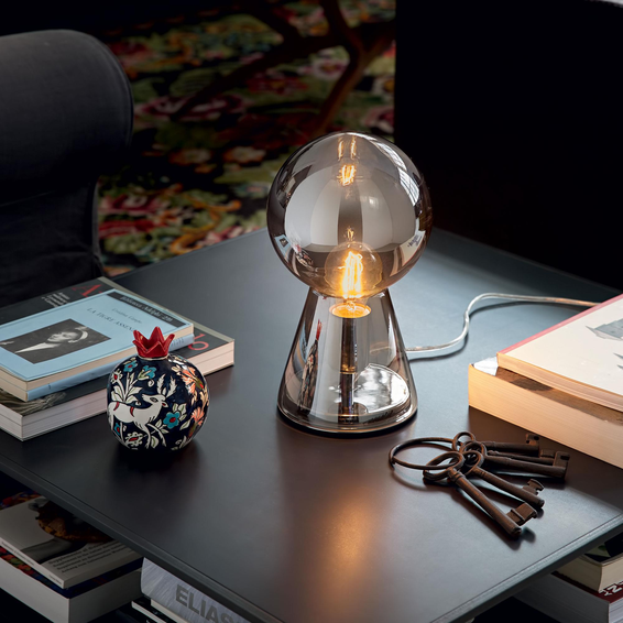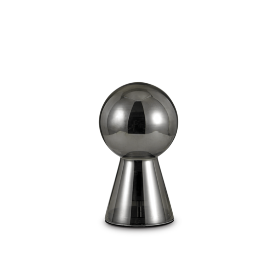Настольная лампа с металлической хромированной основой и рассеиватель из дутого матового белого или серого стекла.