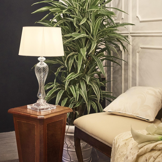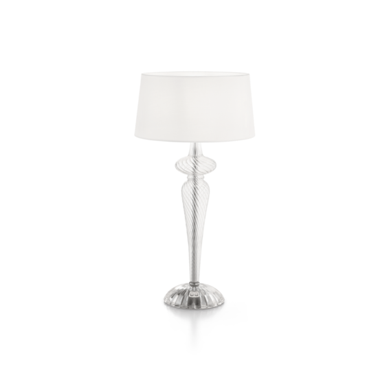 Арматура и детали из хромированного металла. Корпус света из дутого прозрачного стекла ручной работы. Рассеиватель из материала ПВХ покрыт тканью.