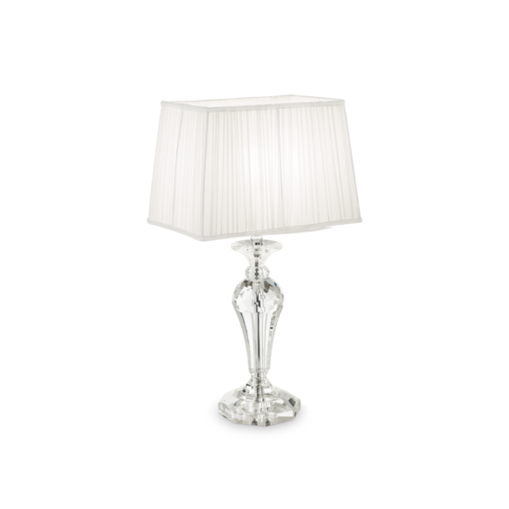 Корпус светильника с элементами из прозрачного хрусталя с фацетом. Абажур из двойной ткани и доступен в квадратной и круглой версии.