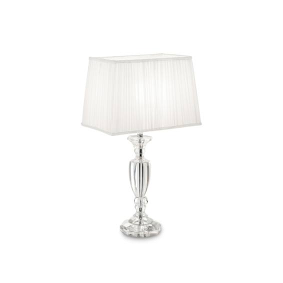 Корпус светильника с элементами из прозрачного хрусталя с фацетом. Абажур из двойной ткани и доступен в квадратной и круглой версии.