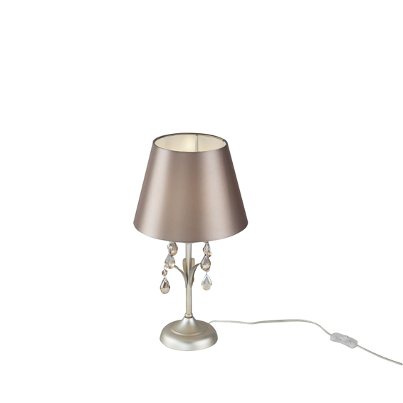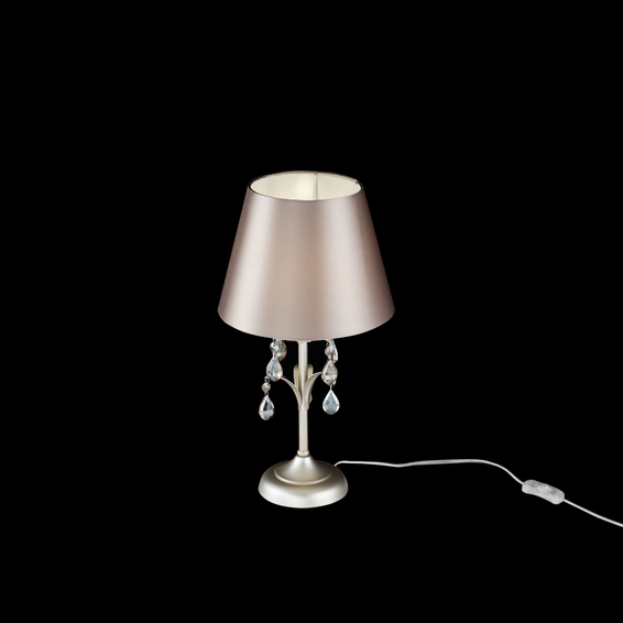 Арматура сделана из металла цвета античного серебра, коричневые абажуры - из атласа. Светильники украшены тонированными повесками.