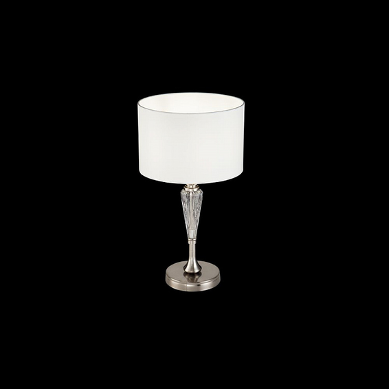 Арматура из металла. Стеклянный элемент в основании. Абажур из ПВХ покрыт белой тканью.