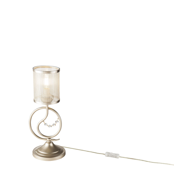 Металлическая арматура цвета матового золота оттеняет абажуры из золотистой органзы. Абажуры декорированы лентой, а арматура люстр — многочисленными подвесками.