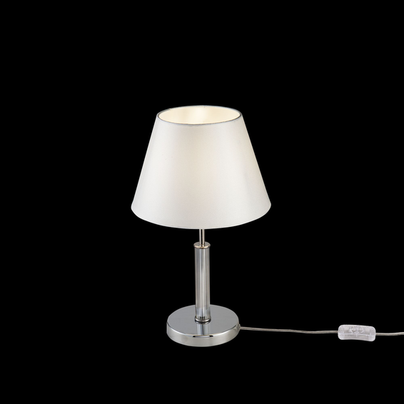 Дизайн арматуры дополнен декоративными элементами из прозрачного стекла. Абажуры сделаны из белой атласной ткани.