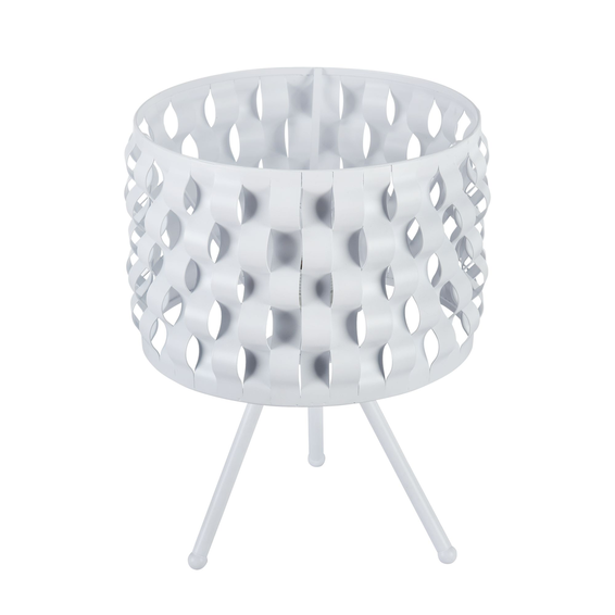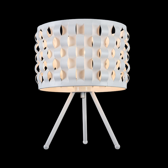 Штатив (тренога) из металла покрыт белым цветом. Необычный дизайн плафона из металлических изогнутых полос.