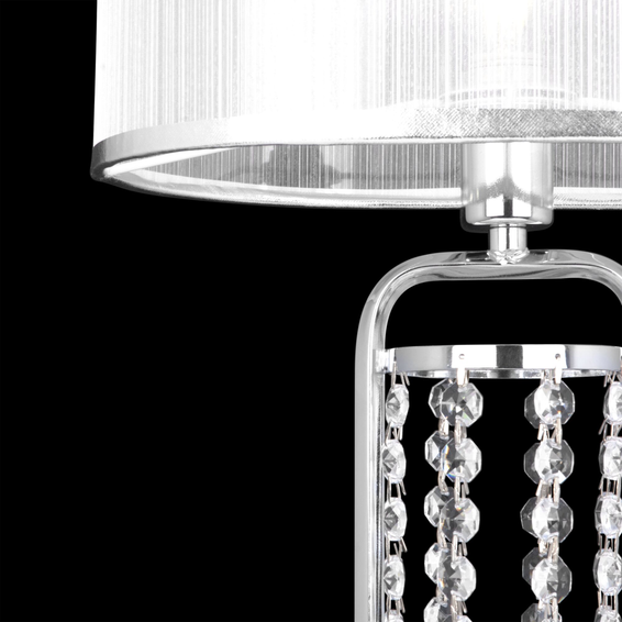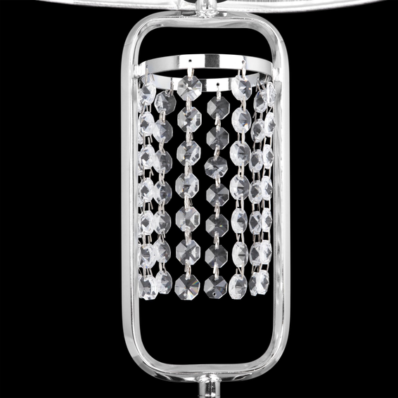 Арматура сделана из металла и украшена декоративными подвесками. Абажуры прямоугольной формы выполнены из полупрозрачной серебристой органзы.