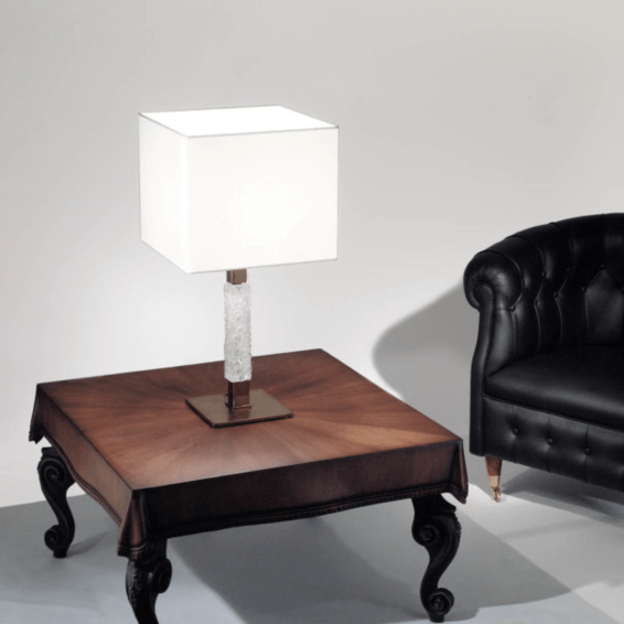 Каркас изготовлен из металла, абажур из ткани chinette цвета слоновой кости или коричневого цвета. Доступен в цветах по металлу: черный никель, сталь, бронза, медь, светлое золото.