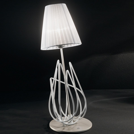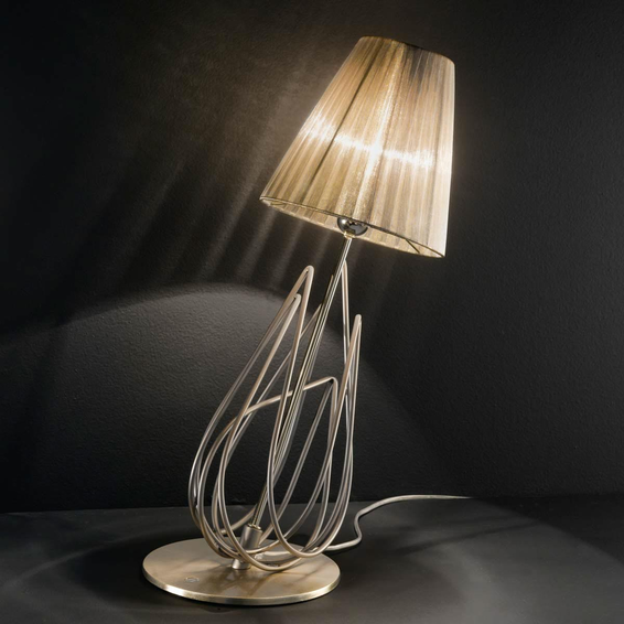 Металлический каркас доступен в разных цветах: бархатное белое и светлое золото,бархатный белый и матовый никель,намибия и матовый никель, намибия и светлое золото,медная и чистая сталь. Коллекция доступна с белым или коричневым абажуром из органзы (код 524). Прозрачные хрустальные подвески.
