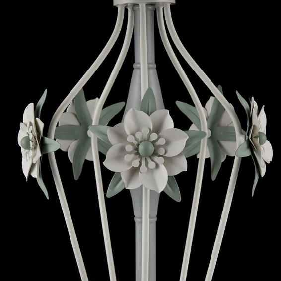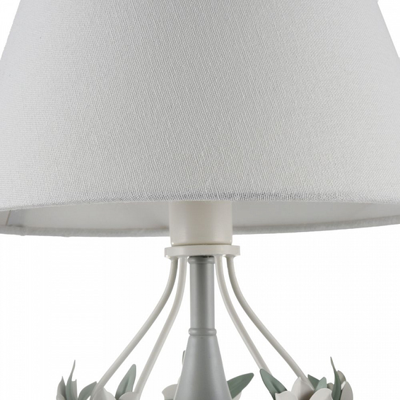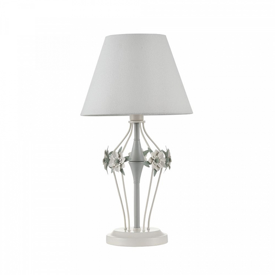 Арматура из металла. Множество декоративных элементов: ажурные ленты, цветы; основание серого цвета. Абажур из ПВХ покрыт белой тканью.