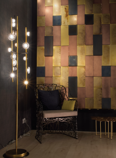 Каркас изготовлен из металла, диффузор прозрачный выполнен из муранского стекла. Доступен в следующих цветах: стальной, полированный кортен, матовое античное золото, светлое золото.