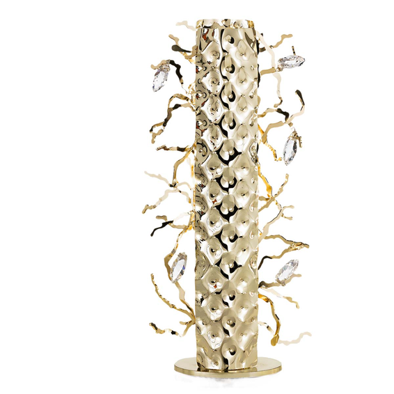 Каркас изготовлен из металла, декоративные элементы и подвески из кристаллов Swarovski. Доступен в следующих цветовых сочетаниях: белый матовый и светлое золото или сталь; черный матовый и светлое золото или сталь; черная фольга и светдлое золото или сталь; светлое золото; сталь.