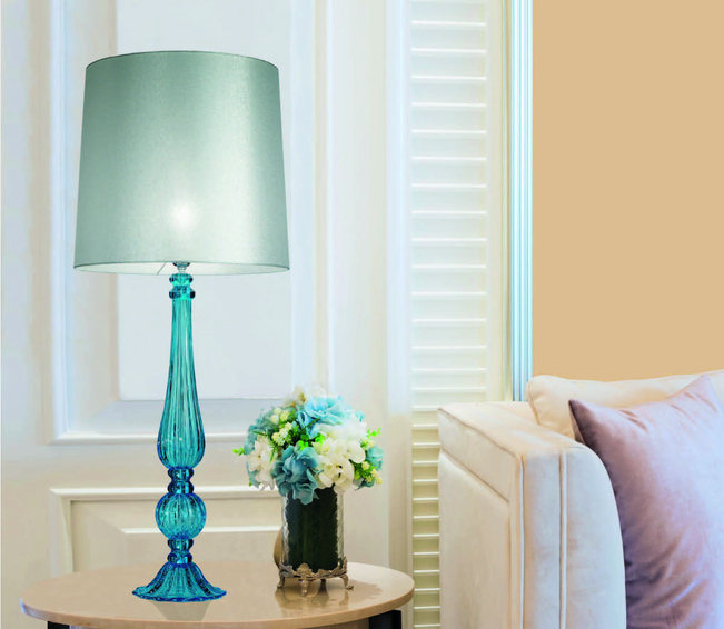 Каркас изготовлен из металла, обрамленного в муранское стекло, абажур из ткани серебристо-лаймового цвета. Доступен в цвете хром и светлое золото.