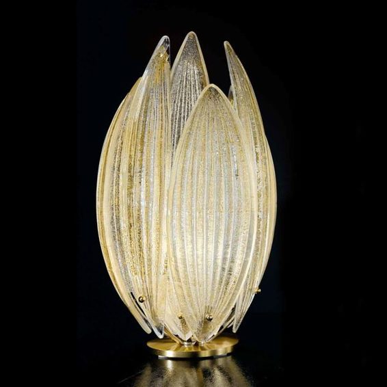 Каркас изготовлен из металла с декоративными элементами в виде лепестков из муранского стекла. Доступен в хроме и светлом золоте с муранским стеклом белого, прозрачного, бронзового, золотого и серебристого цвета.