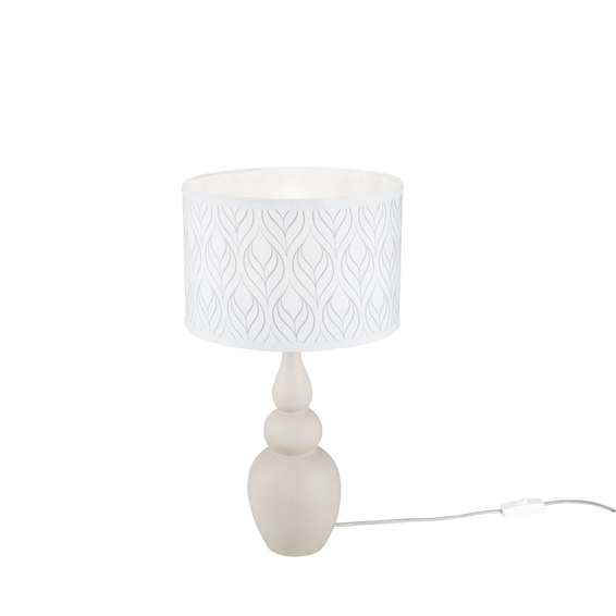 Керамическое основание. Абажур из ПВХ покрыт льняной тканью с узором.