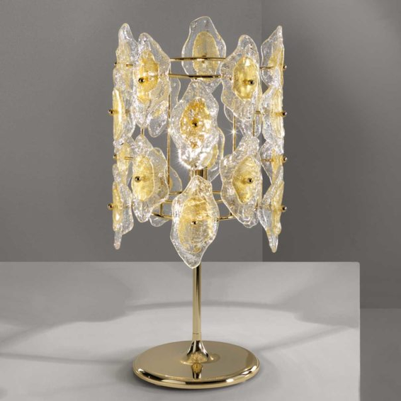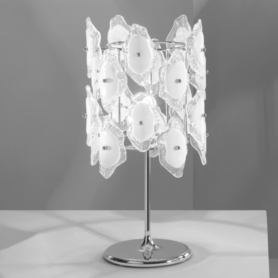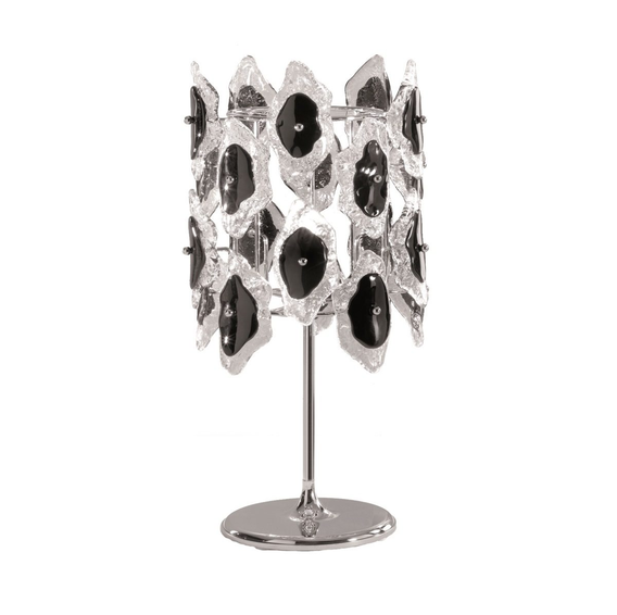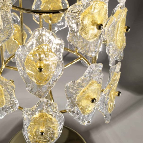 Каркас из металла хромированного или легкого золота.Светильник декорирован муранским стеклом разного цвета:прозрачный черный декорированный,прозрачный белый декорированный,прозрачный золтой декорированный.