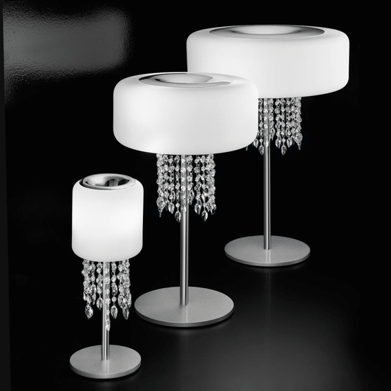 Рама и детали из хромированного металла. Молочно-белый рассеиватель из дутого стекла триплекс с кислотным травлением. Подвески хрустальные SWAROVSKI.