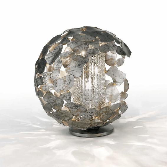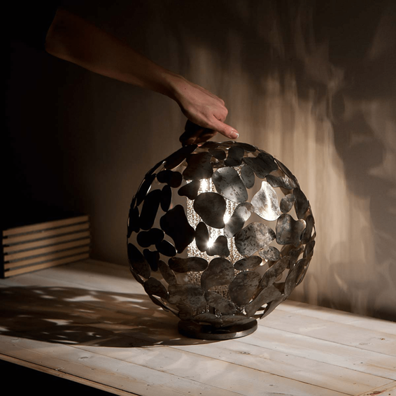 Каркас светильника доступен разных цветов:серебристый кортен с хромированными цепями, коричневый кортен с цепочками из светлого золота.