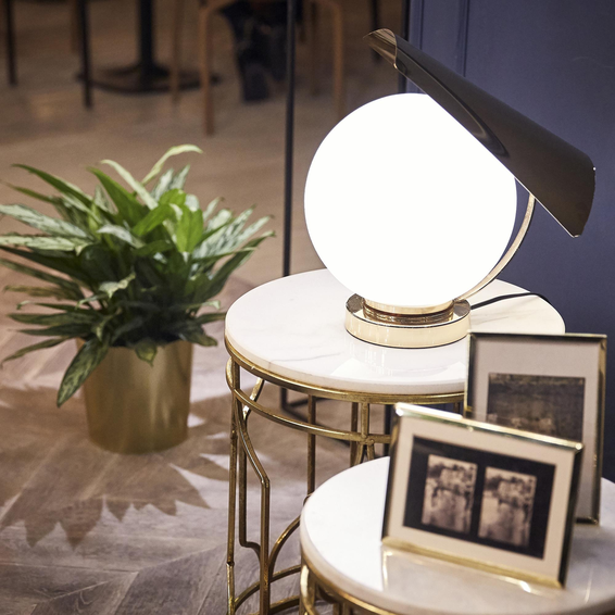 Арматура и верхняя часть из металла латунной или хромированной краски - PENOMBRA TL1 код 176611. Рассеиватель из белого матового дутого стекла.