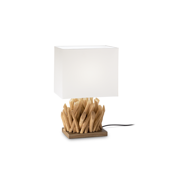 Основа изготовлена из натурального дерева. Корпус светильника состоит из настоящих веток. Абажур из фольги ПВХ, покрытой тканью.