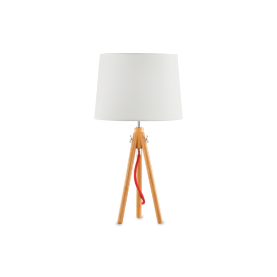 Основа из натурального дерева с металлическими деталями. Абажур из материала ПВХ, покрыт белой тканью. Внешний провод из ткани. Доступен также с арматурой и абажуром в белом или чёрном цвете.