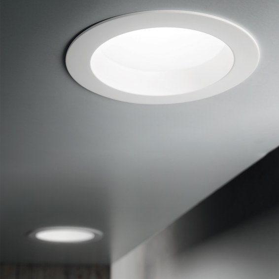 Встраиваемый спот из алюминия с круглой шайбой, подходит для установления на потолки из гипсокартона. Белое матовое покрытие.