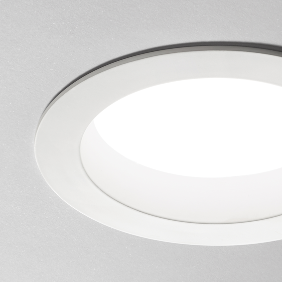 Встраиваемый спот из алюминия с круглой шайбой, подходит для установления на потолки из гипсокартона. Белое матовое покрытие.