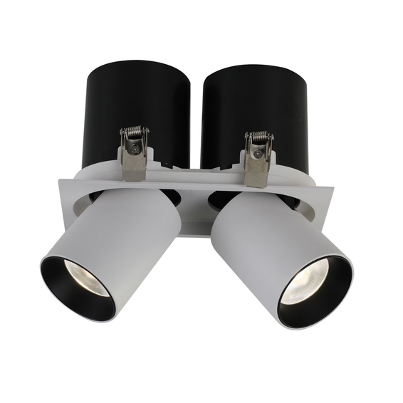 Встраиваемый светильник белого матового цвета с черными элементами.Выдвижной поворотный плафон,который может полностью войти в каркас.