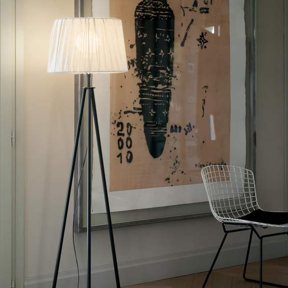 Основа из металла матовой краски. Абажур из натуральной взаимозаменяемой ткани,стирается. Две ткани включены: белая/чёрная и канва.