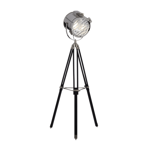 Штатив из дерева окрашенного в черный матовый цвет. Детали и корпус света из хромированного металла. Рассеиватель из прозрачного стекла с внутренними крыльцами для направления света.