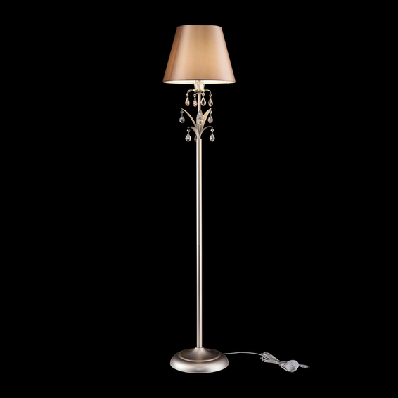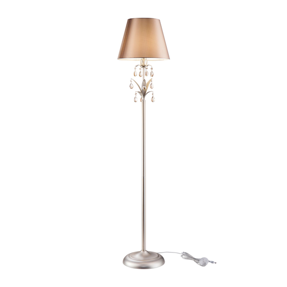 Арматура сделана из металла цвета античного серебра, коричневые абажуры - из атласа. Светильники украшены тонированными повесками.