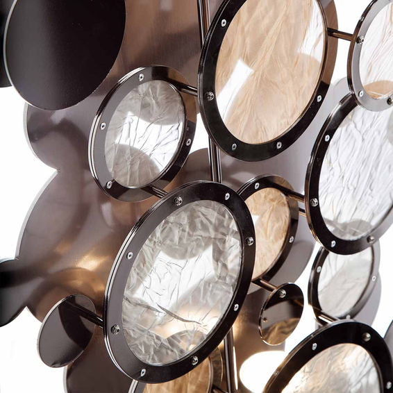 Арматура светильника сделана из металла. Металлическая рама доступна в разных цветах. Декоративные круги со стеклом прозрачного и медного цветов.