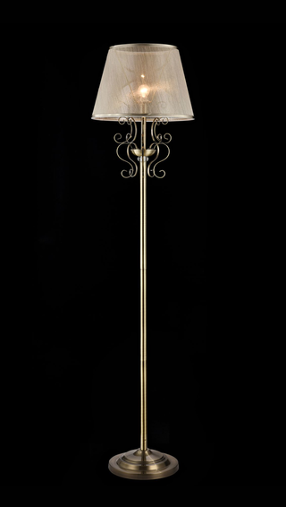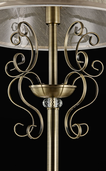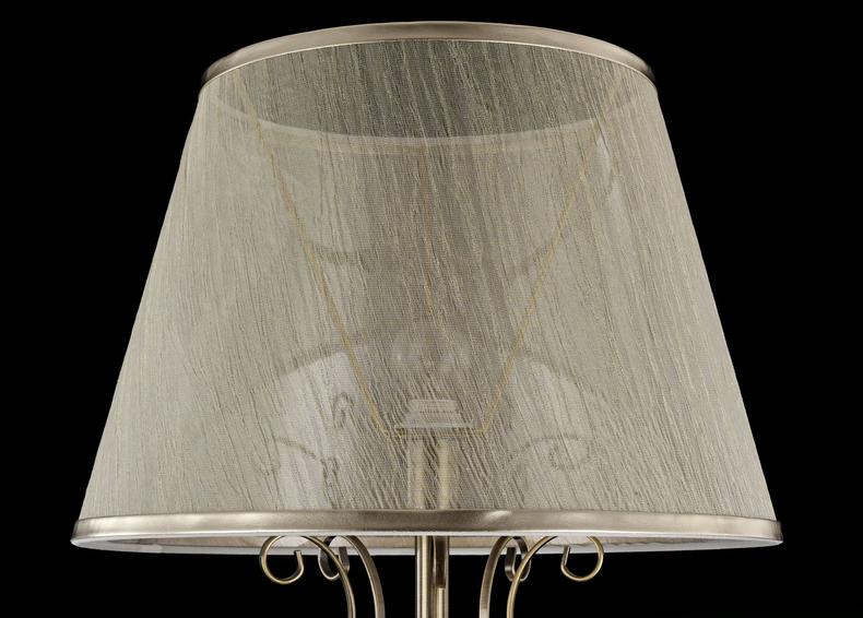 Арматура светильников зополнена завитками на рожках. Абажуры из полупрозрачной органзы выполнены в виде колокольчиков и обрамлены ободками из металла.