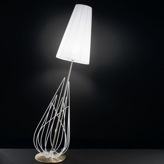 Металлический каркас доступен в разных цветах: бархатное белое и светлое золото,бархатный белый и матовый никель,намибия и матовый никель, намибия и светлое золото,медная и чистая сталь. Коллекция доступна с белым или коричневым абажуром из органзы (код 524). Прозрачные хрустальные подвески.