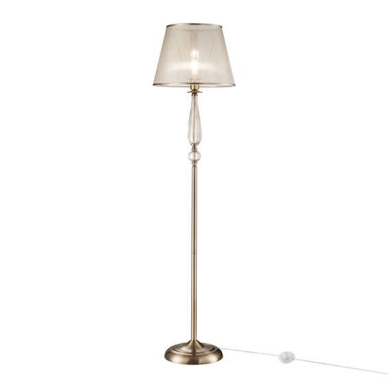 Элементы арматуры из прозрачного стекла коньячного оттенка. Абажуры выполнены из органзы и обрамлены тесьмой в цвет арматуры, сделанной из металла.