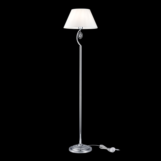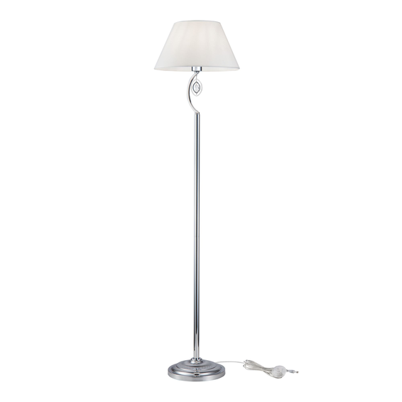 Арматура сделана из металла цвета "хром", а абажуры - из белой ткани. Дизайн светильников дополнен подвесками из хрусталя овальной формы, вокруг которых расположены подвижные декоративные элементы из металла.