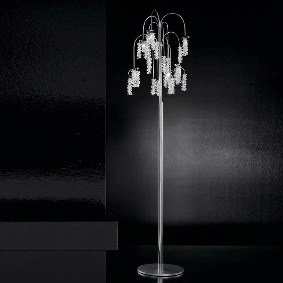 "Каркас из металла хромированного или легкого золота.Подвески из прозрачного хрусталя. Блокировка цилиндрических корпусов диффузора, из атласа Pyrex.Настольная лампа и основание торшера из атласного никеля."