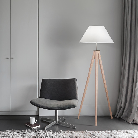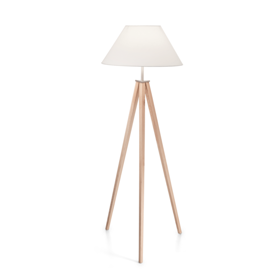 Штатив из натурального дерева. Абажур из материала ПВХ покрыт тканью и с металлической поддержкой никелевого покрытия.