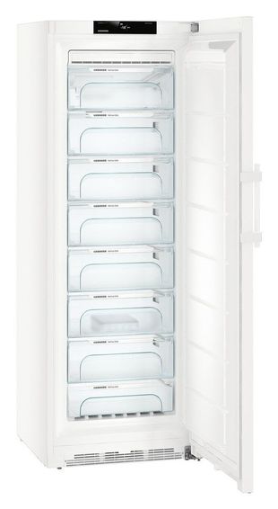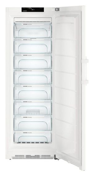 В камере установлено восемь выдвижных контейнеров с системой FrostSafe, которая защищает продукты от притока теплого воздуха при открытии дверцы. Пространство можно моделировать в зависимости от ситуации. Если нужно заморозить большой кусок мяса или несколько багетов, то ящики и стеклянные полки легко вынимаются, освобождая пространство. Яркие светодиоды освещают всю камеру, чтобы быстро найти нужные продукты. В морозильной камере Liebherr GN 5235 установлено электронное управление, поэтому температура регулируется с точностью до градуса от -15°C до -28°C. Вся информация о выбранных режимах работы выводится на сенсорный дисплей. В случае неисправности или незакрытой двери, раздастся сигнализация, а на дисплее появится сообщение. Функция SuperFrost помогает быстрее заморозить свежие продукты. Условия приближаются к шоковой заморозке, что позволяет сохранить не только внешний вид ягод, овощей и фруктов, но также полезные свойства и витамины.Производитель LIEBHERR Тип морозильная камера Высота (см) 195 Ширина (см) 70 Глубина (см) 75 Размораживание морозильной камеры No Frost Цвет корпуса белый Количество секций 8 Общий объем (л) 410 Полезный объем (л) 360 Мощность замораживания (кг/сут) 26 Автономное сохранение холода (ч) 20 Суперзаморозка Да Управление сенсорное Инверторный компрессор да Класс энергопотребления A++ Энергопотребление (кВтч/год) 162 Индикатор неисправности Да Индикатор открытой двери Да Возможность перевешивания двери Да Климатический класс SN-T (от +10°С до +43°С) Уровень шума (дБ) 39 Вес (кг) 101,5 Гарантия 2 года Страна производства Германия
