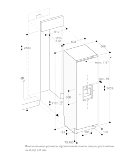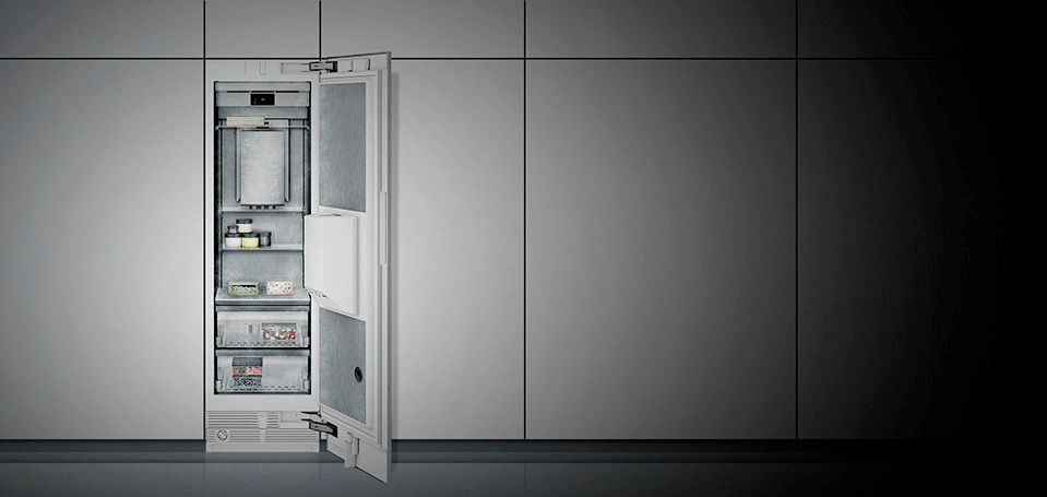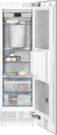 Морозильник Gaggenau встраивается в мебель, открывается с помощью ручки или автоматически. На двери расположен ледогенератор с постоянной подачей воды, режимы работы: лед, крошка и охлажденная вода. В камере установлены полки из закаленного стекла, две из них можно переставить по высоте. Навеска двери справа - артикул RF463304, навеска двери слева - артикул RF463305. • Динамическое охлаждение • Автоматика размораживания с испарением талой воды • Режим Отпуск • При активации режима Отпуск, прибор можно открывать только с помощью ручки • Система оповещения в случае неправильно закрытой/открытой дверцы или неправильной работы прибора • Встроенный WiFi модуль для удаленного управления прибором с помощью смартфона (с помощью приложения Home Connect).