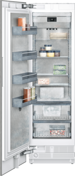 Морозильник Gaggenau полностью встраивается в нишу. Дверь можно перевесить, она открывается с помощью ручки или автоматически. В камере и на двери установлены полки из закаленного стекла, три из них можно переставить по высоте, выдвижные ящики. • Интерьер выполнен из нержавеющей стали с элементами из анодированного алюминия цвета "темный антрацит" • Теплое белое LED освещение, не создающее бликов • Два варианта открывание двери: 1. Автоматическая система открывания, для встраивания в мебельный фронт без ручек 2. Открывание с помощью ручки • Ящики в моделях RC and RF расположены на одной высоте. При установке side-by-side стеклянные полки и полки на двери можно установить на одном уровне. • Материалы и внутренний дизайн соответствуют моделям RC: - Стеклянные полки - Полки на двери из анодированного алюминия в цвете "темный антрацит"