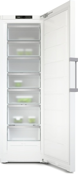 Отдельно стоящий морозильник Цвет корпуса и фронтальной панели: белый Дверной упор правый переставляемый Объединение в сеть с Miele@home Гидравлический доводчик двери SoftClose Системы VarioRoom, NoFrost Скрытая удобная ручка дверцы EasyOpen Управление SensorTouch Точная настройка температуры морозильной камеры