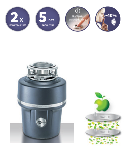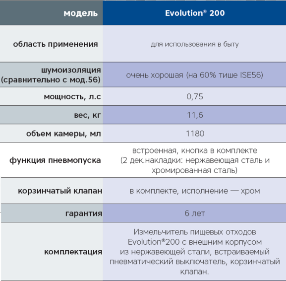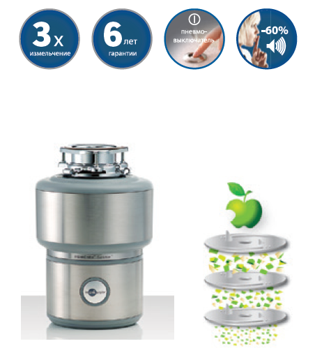 Не беспокойтесь о том, какие отходы можно, а какие нельзя измельчать: ведь Evolution®200 справляется с любыми видами пищевых отходов. Трехступенчатая технология измельчения с максимально тихой работой мотора. Встраиваемая кнопка пневматического управления Air Switch. Усилитель мощности с микропроцессором увеличивает крутящий момент, что позволяет справиться с наиболее плохо поддающимися измельчению продуктами. Функция автоматического реверсирования увеличивает срок службы и повышает надежность эксплуатации. Износостойкий индукционный мотор Dura-Drive. Система авто-стоп при перегреве и перегрузке. Система быстрого монтажа. Эксклюзивная технология для всех, особенно для тех,кто часто принимает гостей. Самая мощная и бесшумная модель.