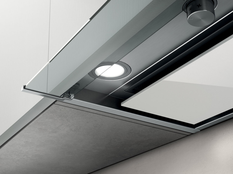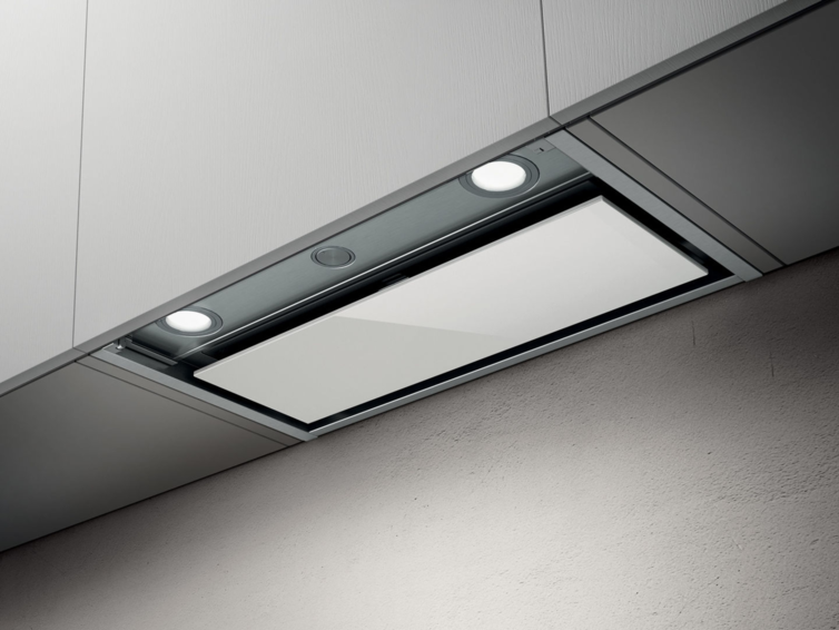 Комфорт и безопасность: Встраиваемая в подвесной шкаф вытяжка ELICA BOX IN PLUS выполнена из нержавеющей стали. Дизайн дополнен выдвижной панелью из прозрачного стекла.