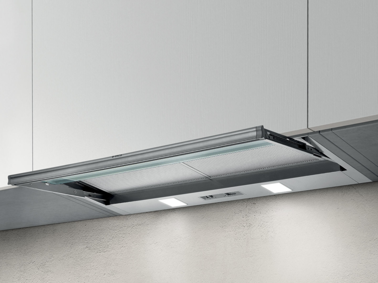 Комфорт и безопасность: Встраиваемая в подвесной шкаф вытяжка. Дополняется выдвижным козырьком из прозрачного стекла, за которым расположен эффективный алюминиевый фильтр.