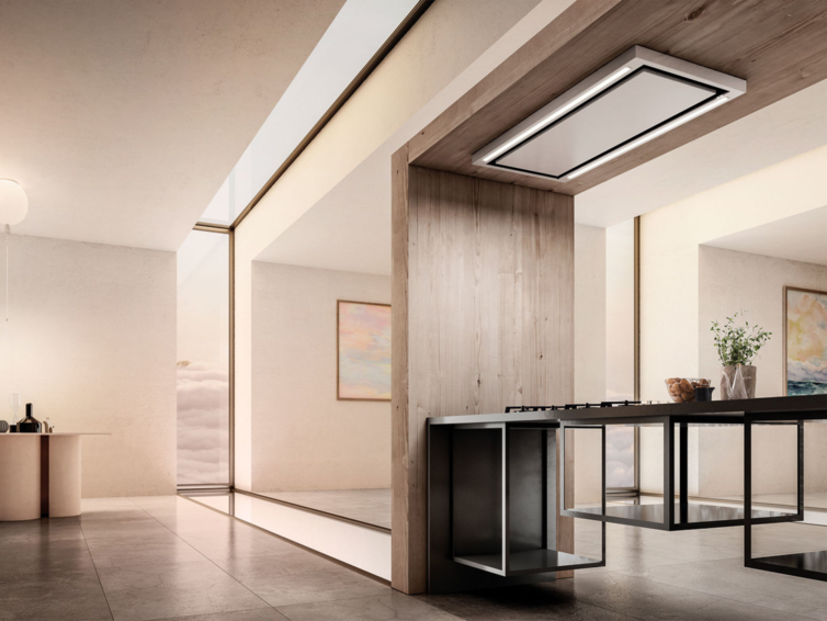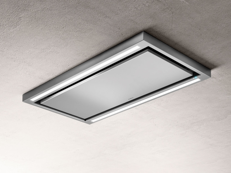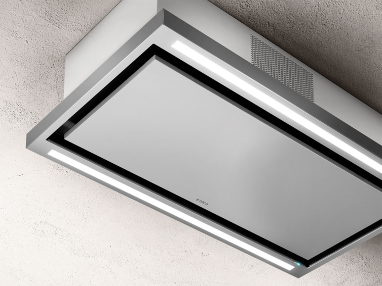 Комфорт и безопасность: Островная вытяжка ELICA CLOUD SEVEN IX/A/90 с потолочным монтажом выполнена в цвете «нержавеющая сталь».